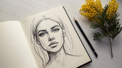 Open sketchbook with approximate charcoal drawing of a woman's face