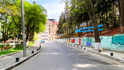Moscow, Russia - April 18, 2023: cyclist rides on the bike path in the park