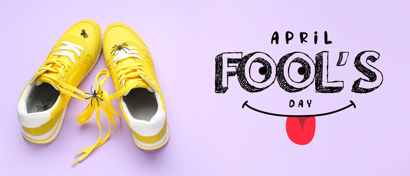 Sneakers with tied shoe laces and spiders on lilac background. April Fools' Day celebration