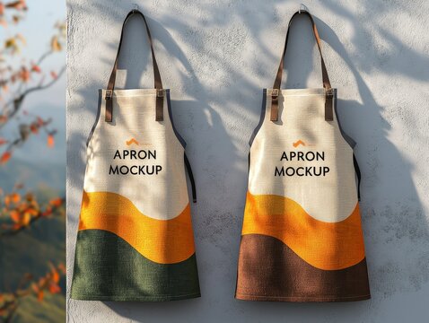 Two Apron Mockups Hanging on a White Wall with a Blurred Fall Foliage Background