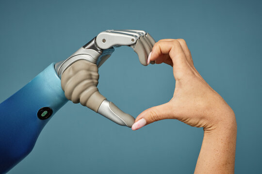 Closeup image of woman making heart shape with bionic hand