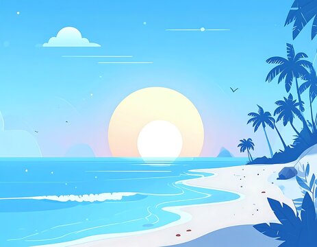 Calm, stylized seascape with gentle waves, palm trees, and a serene sun, bathed in pastel blues and whites