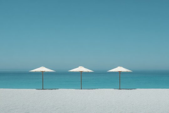 Three beach umbrellas on a white sand beach, facing a tranquil turquoise sea
