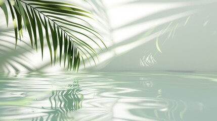 Palm leaf with shadow reflections on rippling water surface background with place for text. Minimalist tropical aesthetic
