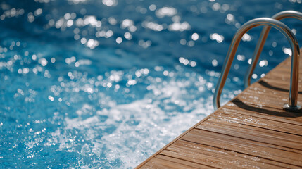 Luxury outdoor swimming pool close-up, stainless steel ladder framed by clear aqua water and smooth wooden decking, soft highlights and shadows creating a tranquil, upscale ambianc