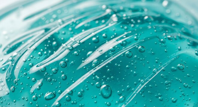 Turquoise blue gel with bubbles. Transparent liquid with air drops. Abstract background for cosmetic, medical, or hygiene product concept. Color of 2026.