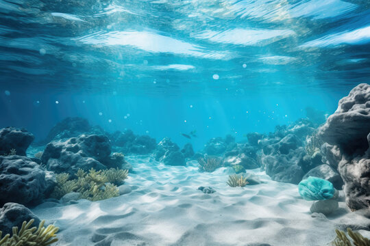 Underwater with colorful sea life fishes and plant at seabed background, Colorful Coral reef landscape in the deep of ocean. Marine life concept, Underwater world scene.
