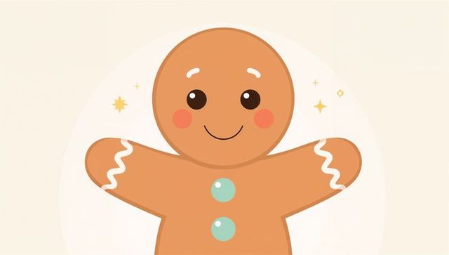 Smiling gingerbread cookie waving arms with icing cuffs and aqua buttons on beige backdrop