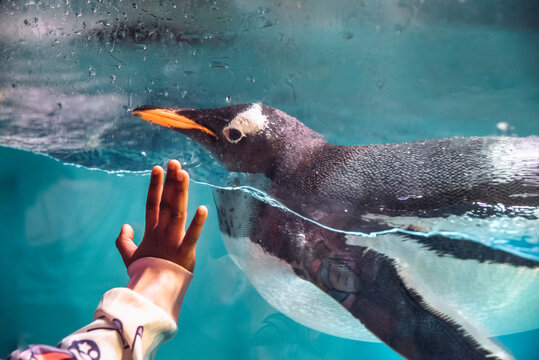 Captive cute Gentoo penguin looking at child while swimming in water tank in an aquarium or zoo. Child's hand can be seen against the water tank glass, trying to touch and welcome the friendly penguin
