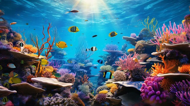Colorful exotic fish swimming in deep blue water aquarium with green tropical plants