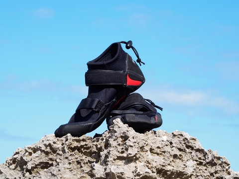 reef boots lie on corals and reefs. near the ocean. sunny day.