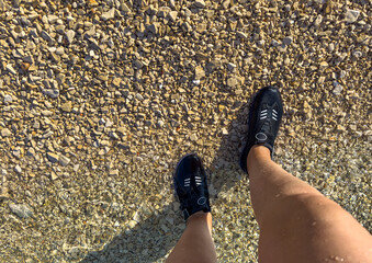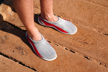 Protective neoprene shoes for coral and stones at sea. Aquashoes slippers for walking on corals. Legs of man in gray slippers, shoes for stones beach which protect foot on shore of pebbly beach sea