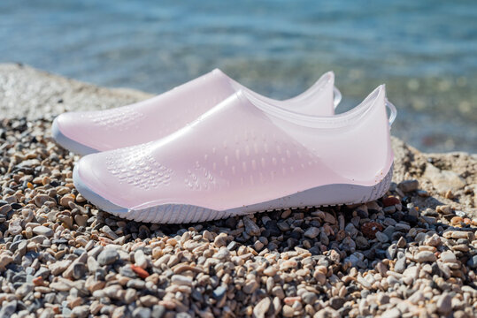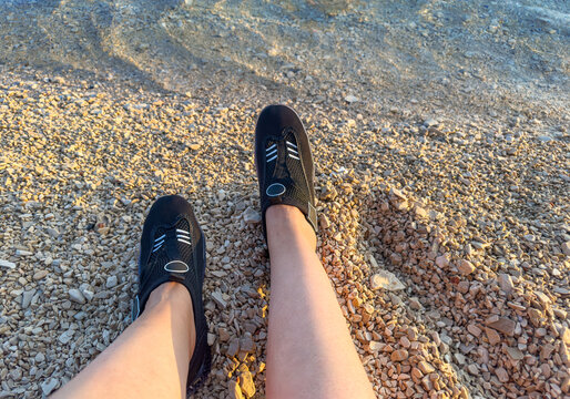 Swimming shoes, rubber aqua shoes, coral shoes, resort town on vacation in Zadar, Croatia