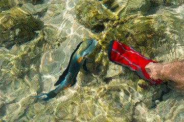 Male feet in red aqua shoes near swims surgeon fish between reef