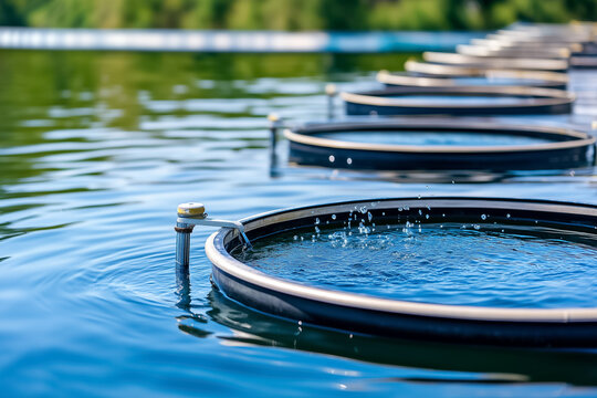 Circular fish farming enclosures floating on calm blue water with forest in background, part of modern aquaculture system. Concept sustainable seafood, aquatech, environmental farming