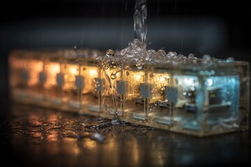 Water Flowing Over Illuminated Electrical Connectors in Dim Light