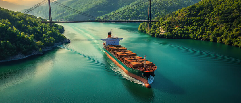 A stunning view of a cargo ship navigating through serene waters, surrounded by lush greenery and a majestic bridge in the background.
