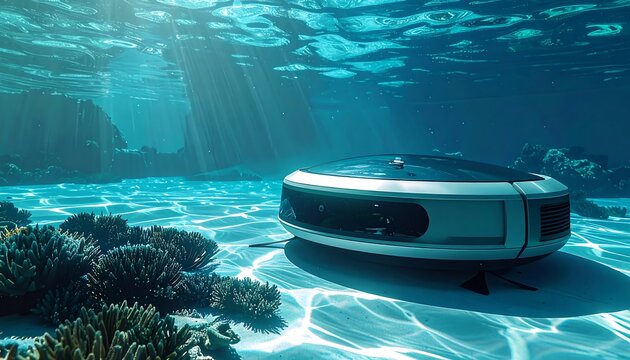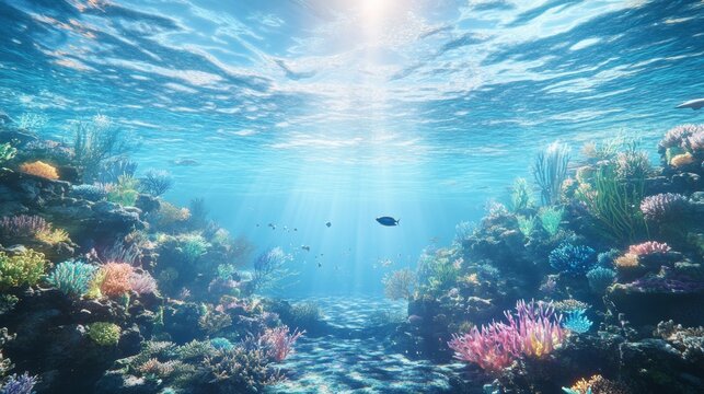A futuristic ocean with glowing coral reefs and holographic marine life