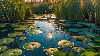 Dragonfly resting on pond with lily pads reflects sunlight beautifully