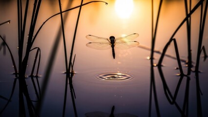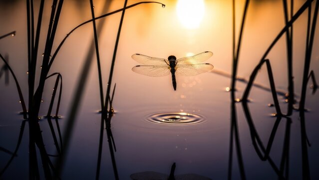 Dragonfly hovering over tranquil water, golden hour reflecting