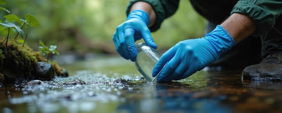 Tiny researchers examining a massive puddle of water. environmental research, water conservation, scientific inquiry, ecological research concept. Selective focus banner