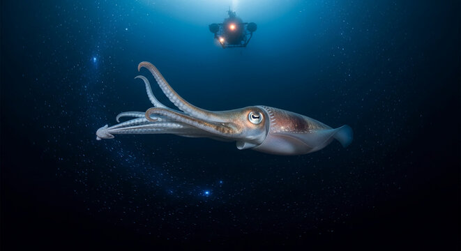 Two futuristic underwater drones scan the dark ocean floor with powerful lights. Concept of deep-sea robotics, marine exploration, technology, and environmental research in extreme conditions.