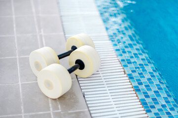Two pieces of aquatic exercise equipment, a buoyant dumbbell and a swim noodle, are positioned by the edge of a swimming pool. Water-based fitness, hydrotherapy, and rehabilitation exercises.