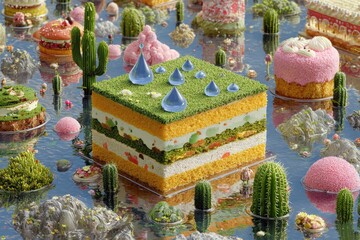 Dessert islands in a sweet, watery landscape.  Rain drops fall on a layered cake island.  Surrounded by other cakes, cactuses, and  miniature mountains