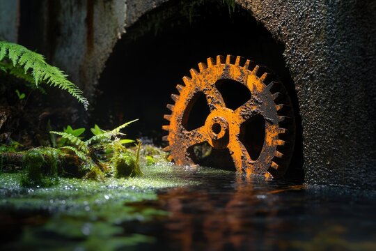 Rusty gear wheel submerged in a mossy, dark, watery environment, reminiscent of an overgrown industrial ruin.