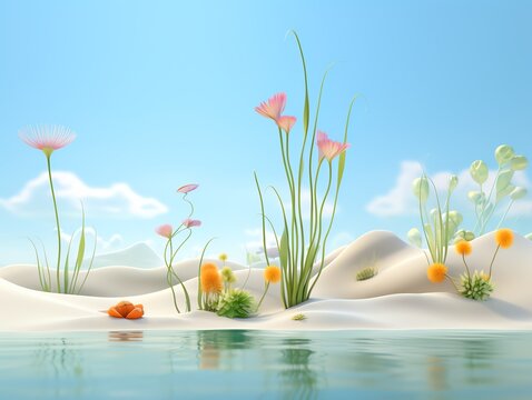 Flowers and plants grow on a white sandy beach next to a body of water under a blue sky.
