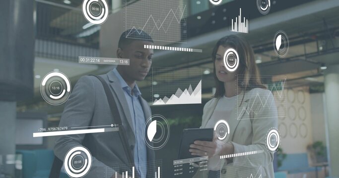 Diverse team collaborating over ar dashboards and data visualization in open office