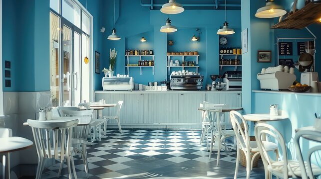 Captivating cafeteria interior design, blue themed , tables and chairs