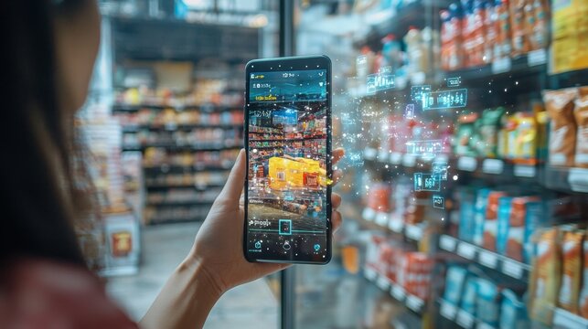 Man Using Tablet in Supermarket with Augmented Reality Display.