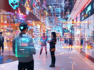 Futuristic Smart Shopping Mall with Interactive Displays and Automated Checkout