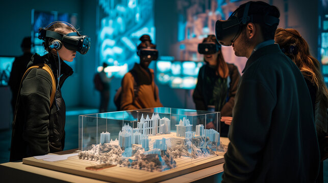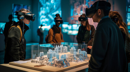 Teacher guiding students exploring wind energy with ar holograms in classroom