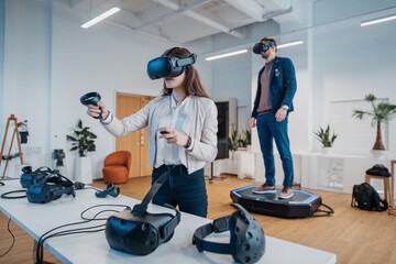 Stepping into Innovation: Professionals immerse themselves in a cutting-edge virtual reality experience, exploring the future of business with VR headsets and haptic feedback technology.