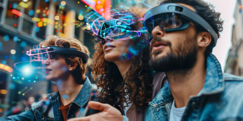 A group of people using augmented reality glasses to navigate a city and explore interactive guides