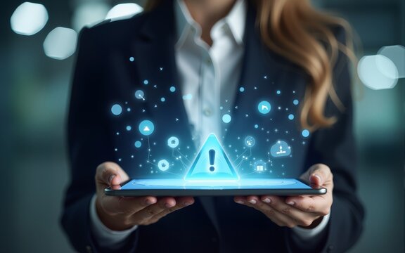 Woman holding a tablet with floating warning symbols, digital ar. High quality