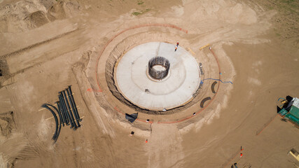Aerial view of concrete foundation ready to be assembled in a new wind turbine park.