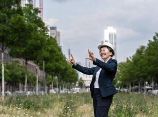 Smiling professional presenting holographic green building on tablet for sustainable design