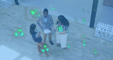 Business team collaborating, reviewing tablet with augmented reality sustainability icons