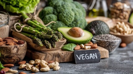 Healthy vegan ingredients arranged on a rustic table, ready for cooking.