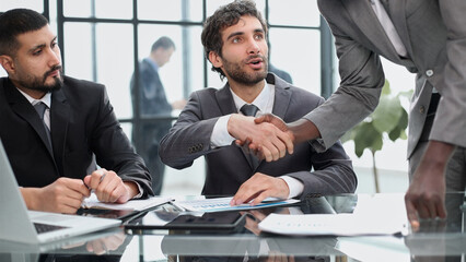 Handsome smiling Moroccan businessman using laptop computer working online sitting in modern office. Portrait of happy successful middle eastern manager looking at camera sitting at workplace