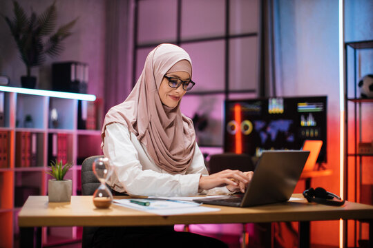 Experienced muslim businesswoman, economist, broker in hijab wearing eyeglass sitting at table with laptop at evening time at office. Concept of deadline of project.
