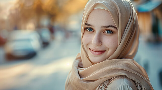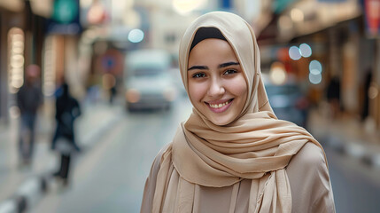 Successful middle eastern businesswoman standing in big city modern skyscrapers dreaming on new opportunities