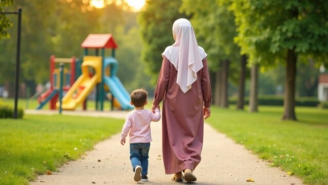 Muslim woman spends time with her child, family values ​​and care. Mother walks with her child in a summer park. Islam, traditional clothing of Muslim women