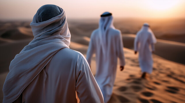 Faceless Arabic men in Dubai desert wearing traditional white robes, cultural heritage scene, sand dunes landscape, Middle Eastern clothing photography, with copy space