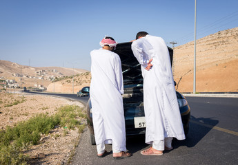 Two young Arab men having car issue on the road