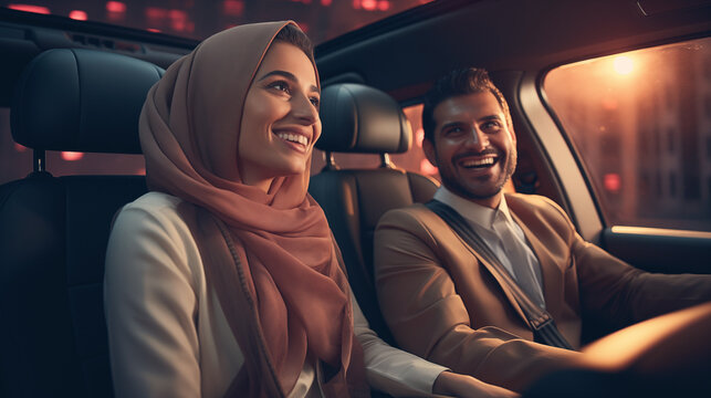 Beautiful overjoyed young smiling muslim woman in traditional religious hijab reading great news on smartphone - generative AI, fiction Person
