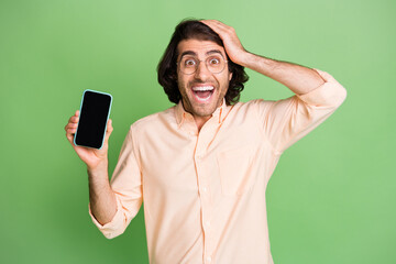 Portrait of attractive amazed cheerful overjoyed guy holding in hand gadget new product isolated over bright green color background